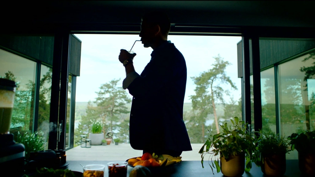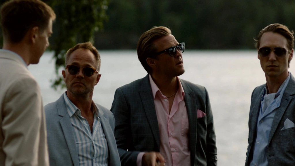 «Выход есть» привлекает нас не только с точки зрения сценария — он визуально очень хорош. Здесь есть традиционный скандинавский минимализм: холодные интерьеры, стерильные офисы, роскошь без излишеств. И в противовес этому — пьяные вечеринки, окутанные дымом, неоном, хаосом. Монтаж классный: сцена диалога может оборваться вставкой с интервью, после которой последует очередной кутеж на грани фола.
