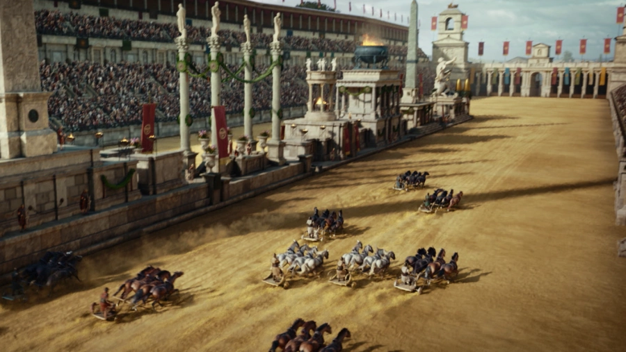 Параллельно развиваются и другие конфликты. Повелитель трущоб и подпольного мира ставок Тенакс (на его мрачном секрете будет держаться одна из центральных интриг шоу) пытается подняться по социальной лестнице и собирает команду для гонок на колесницах во главе со скоростным Скорпом. Колизей вот‑вот должен стать главной ареной Римской империи, и люди вкладывают огромные деньги в это зрелище. Мир гонок чем‑то напоминает соревнования в «Формуле‑1»: здесь тоже есть тренеры, составы команд, спонсоры и призы — только на древнеримский лад. И Домициан, и Тит, и знатные семьи Рима используют гонки как способ увеличить свое политическое влияние. Поэтому остальные герои становятся пешками в их руках.